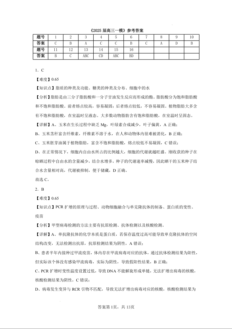 湖南省长沙市望城区一中2024-2025学年下学期3月高三一模生物答案