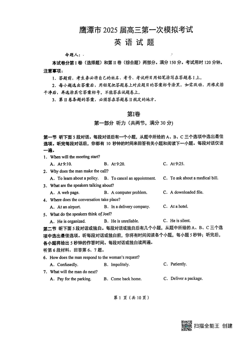 江西省鹰潭市2024-2025学年下学期3月高三第一次模拟考试英语+答案