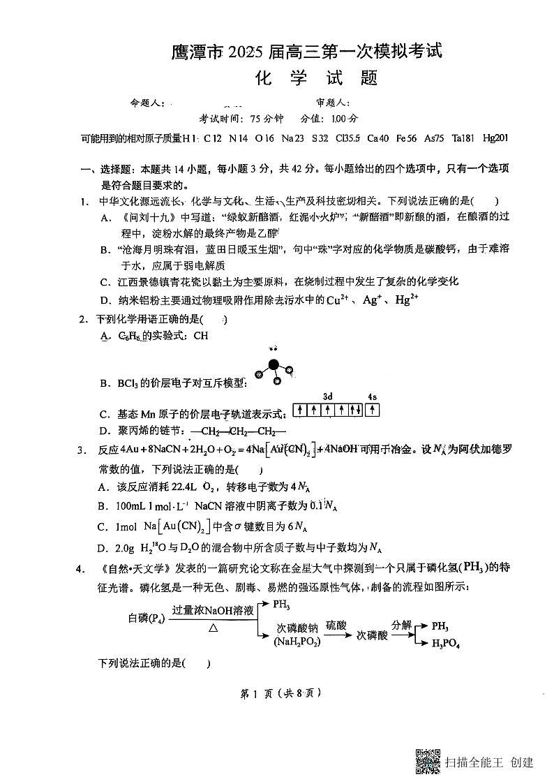 江西省鹰潭市2024-2025学年下学期3月高三第一次模拟考试化学