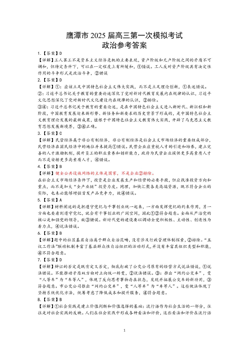 江西省鹰潭市2024-2025学年下学期3月高三第一次模拟考试政治答案