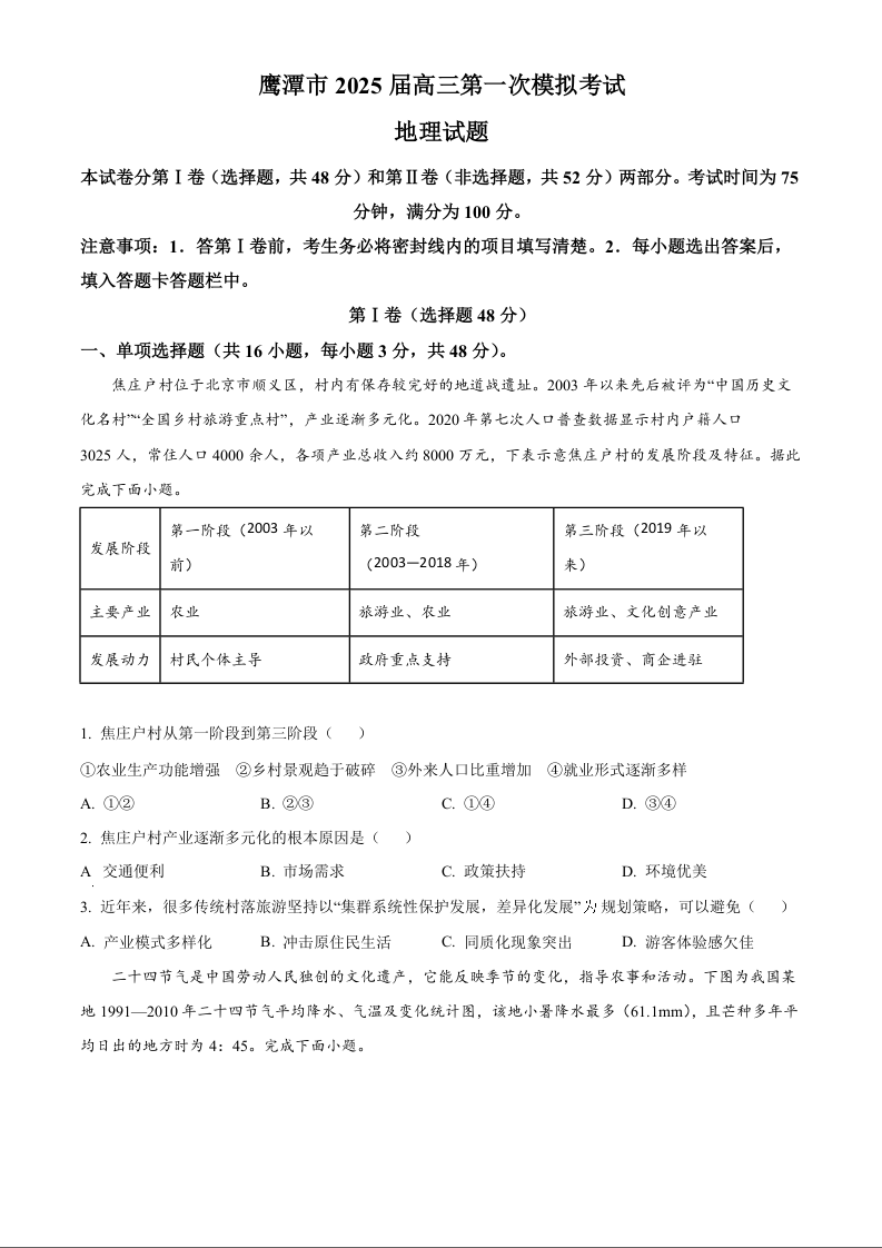 江西省鹰潭市2025届年高三下学期第一次模拟考试地理