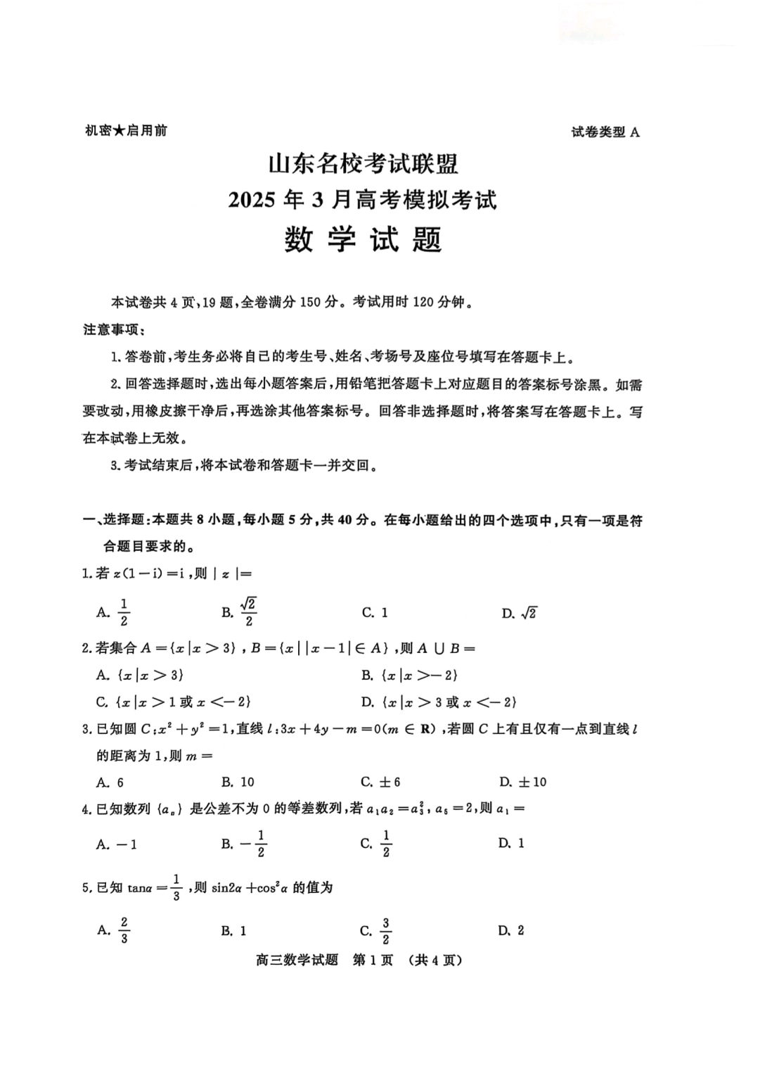 山东名校考试联盟2024-2025学年下学期3月高三高考模拟数学+答案