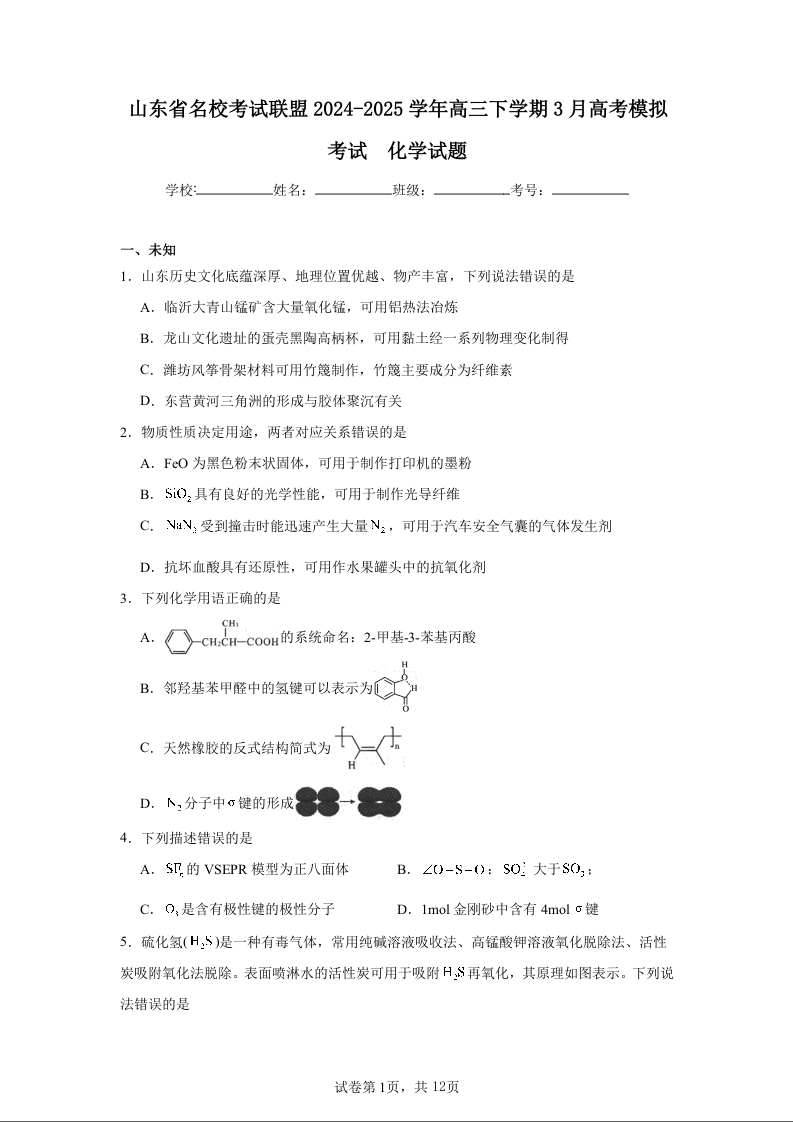 山东名校考试联盟2024-2025学年下学期3月高三高考模拟化学