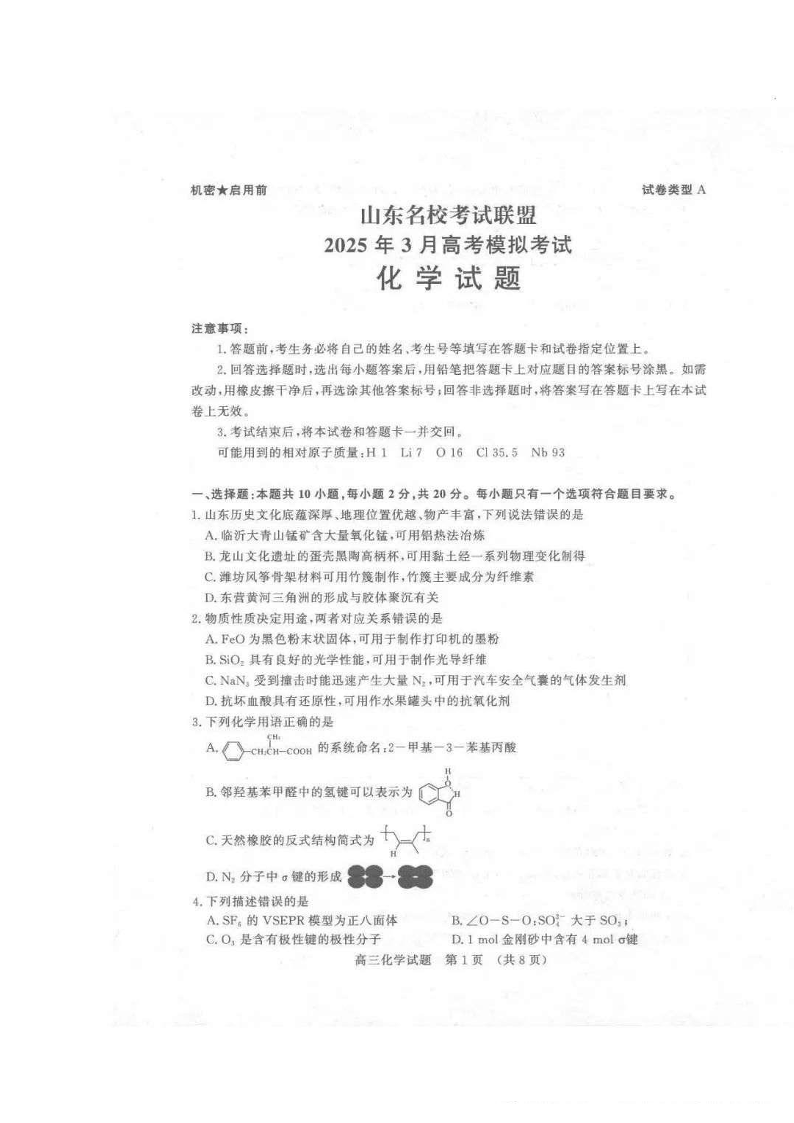 山东名校考试联盟2024-2025学年下学期3月高三高考模拟化学+答案