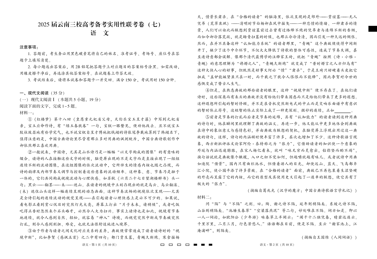 云南省三校2024-2025学年下学期3月高三备考实用性联考(七)语文