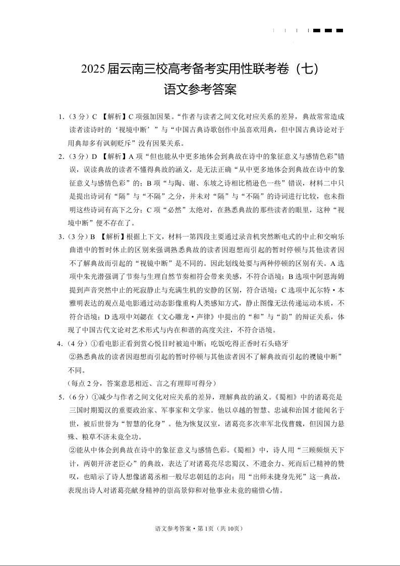 云南省三校2024-2025学年下学期3月高三备考实用性联考(七)语文答案