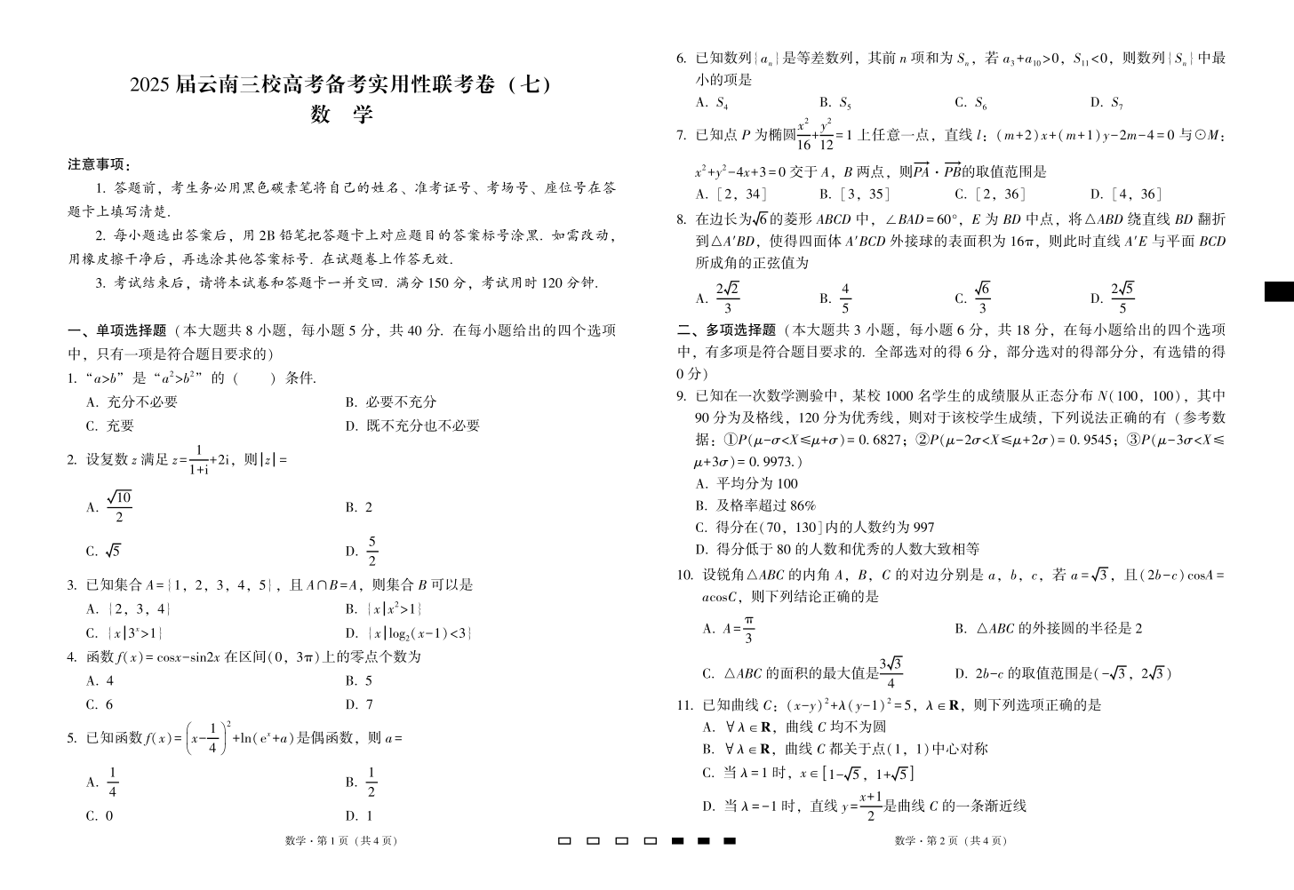 云南省三校2024-2025学年下学期3月高三备考实用性联考(七)数学
