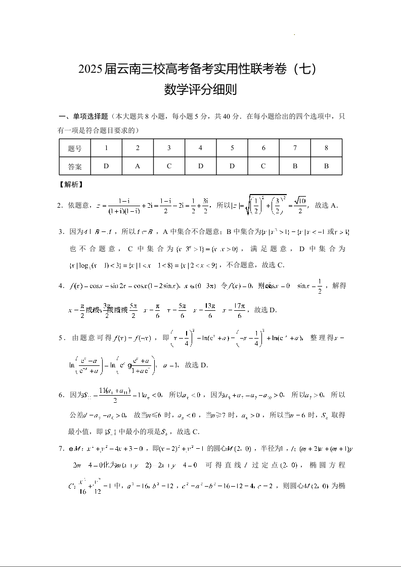 云南省三校2024-2025学年下学期3月高三备考实用性联考(七)数学答案