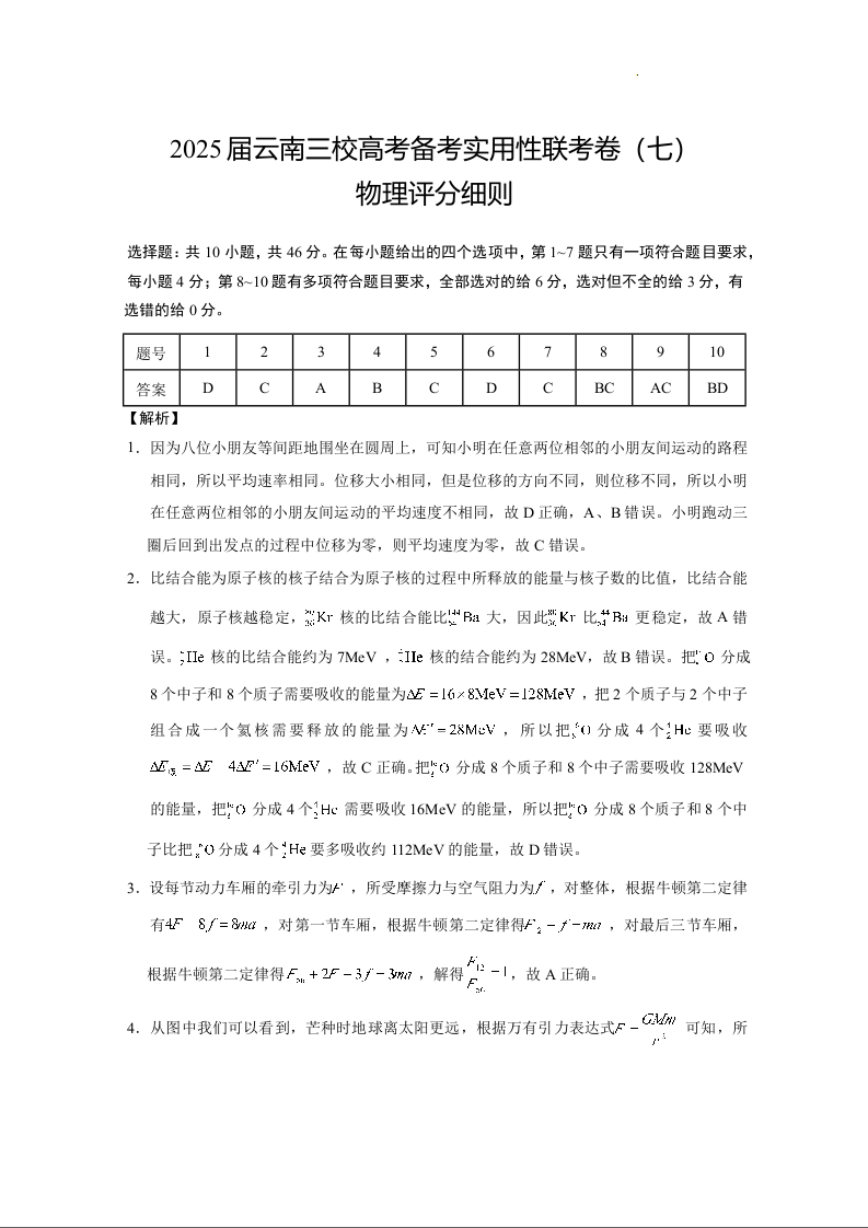 云南省三校2024-2025学年下学期3月高三备考实用性联考(七)物理答案