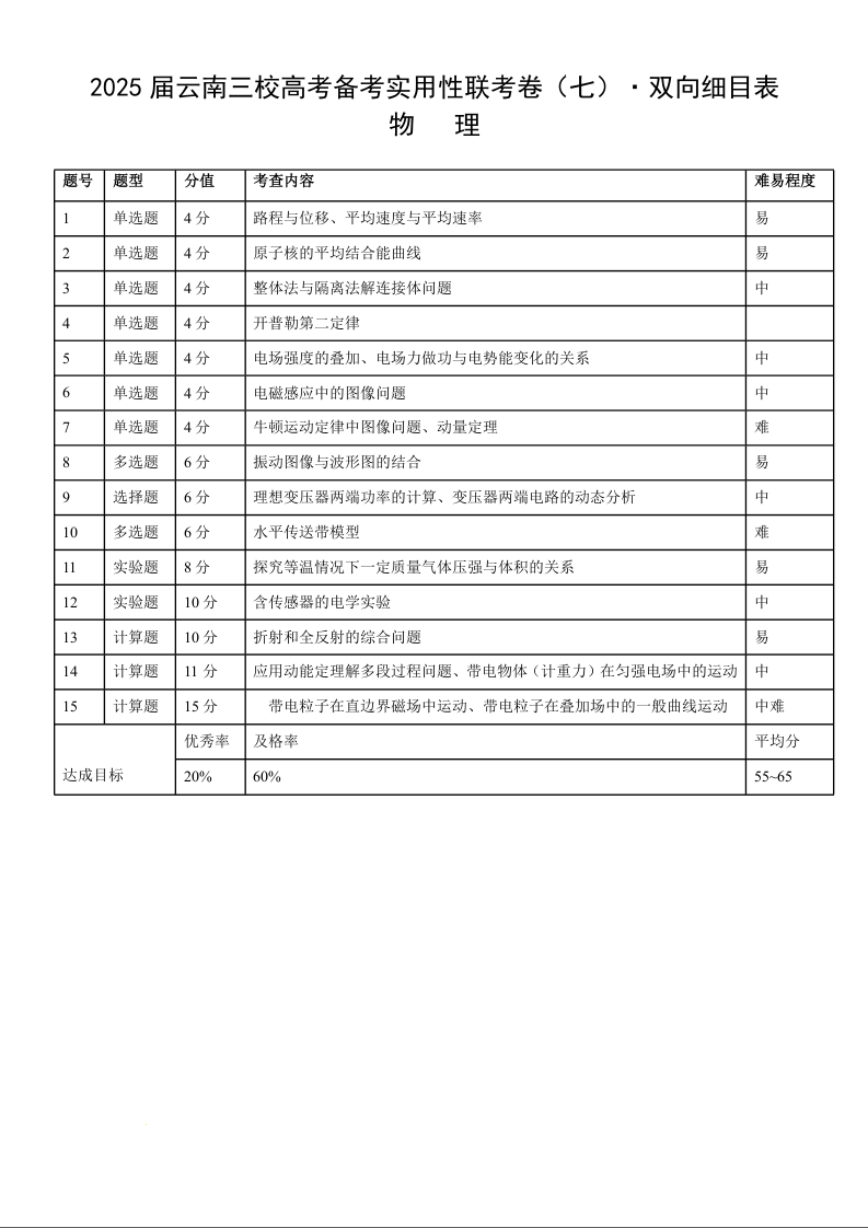 云南省三校2024-2025学年下学期3月高三备考实用性联考(七)物理双向细目表