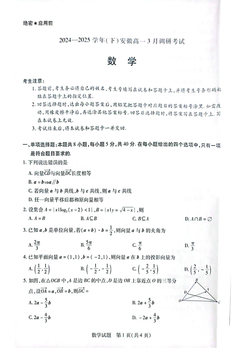 安徽省滁州市部分学校2024-2025学年下学期3月高一月考数学+答案