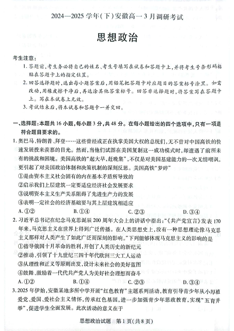 安徽省滁州市部分学校2024-2025学年下学期3月高一月考政治+答案