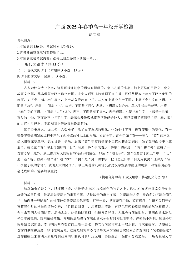 广西壮族自治区柳州市2024-2025学年下学期高一开学检测语文+答案