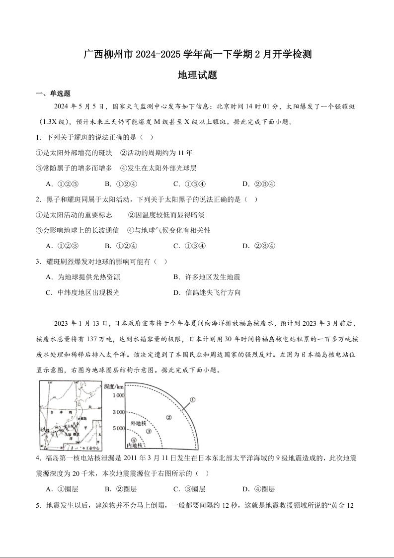 广西壮族自治区柳州市2024-2025学年下学期高一开学检测地理+答案
