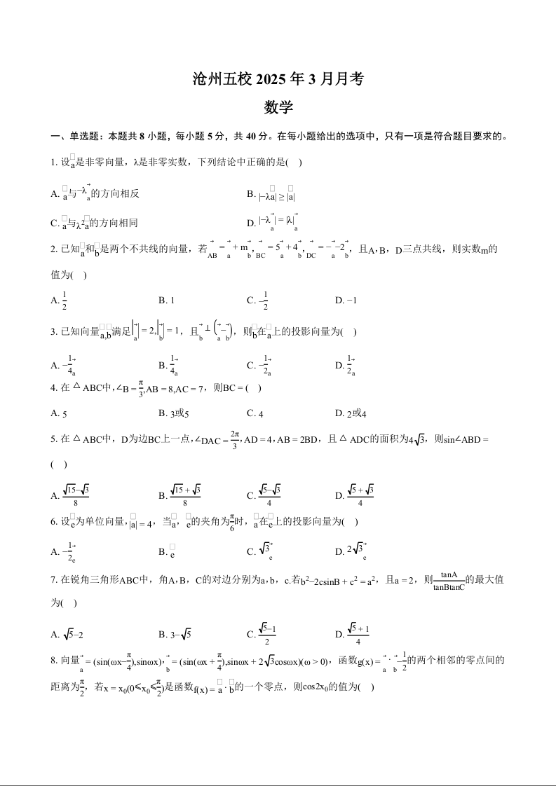 河北省沧州市五校2024-2025学年下学期3月高一月考数学+答案