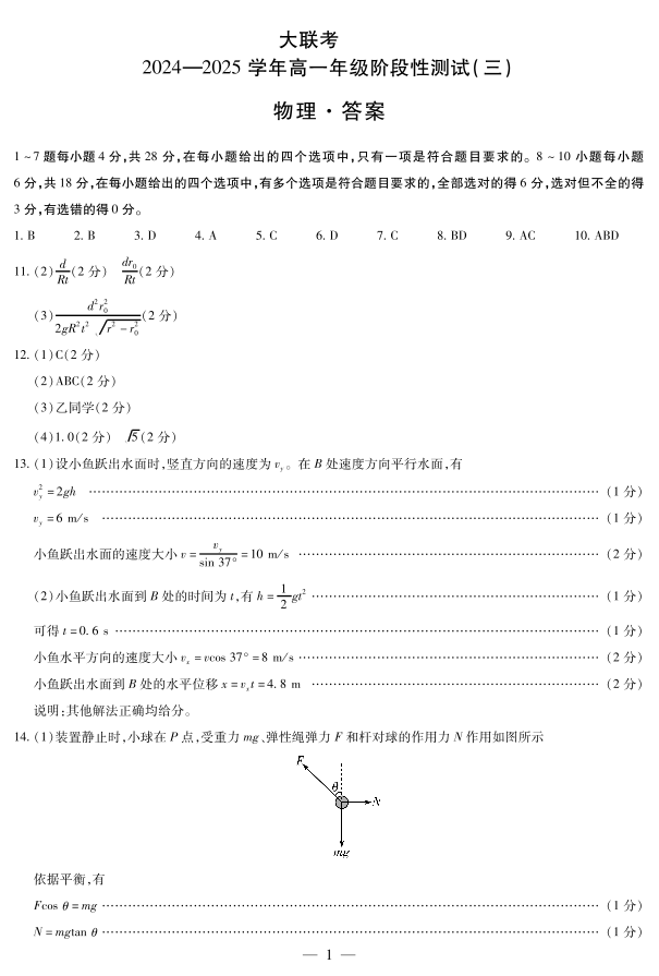 河南省创新发展联盟2024-2025学年下学期3月高一月考物理答案
