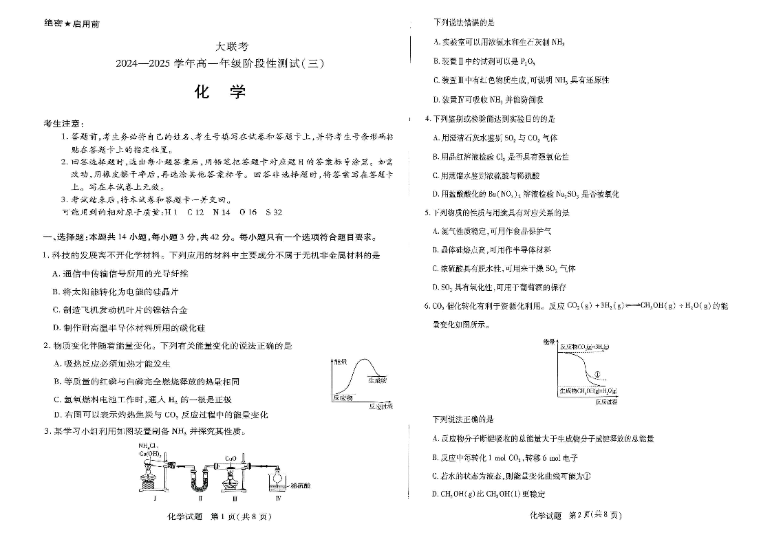 河南省创新发展联盟2024-2025学年下学期3月高一月考化学