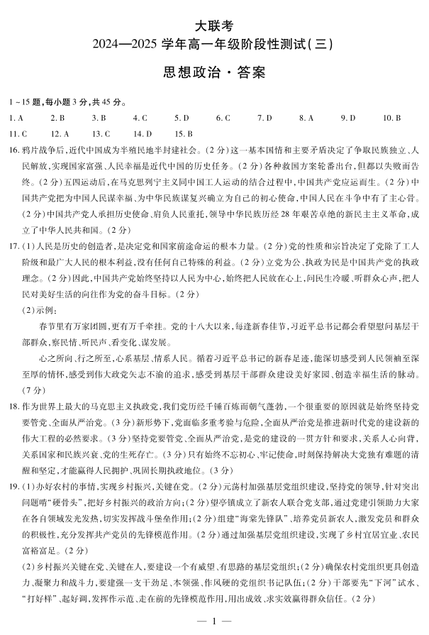 河南省创新发展联盟2024-2025学年下学期3月高一月考政治答案