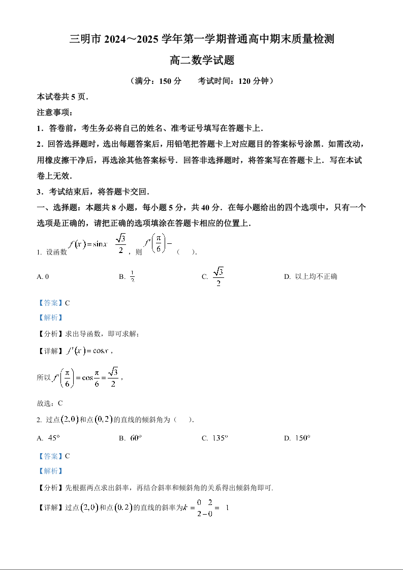 福建省三明市2024-2025学年上学期1月高二期末考试数学(解析版)