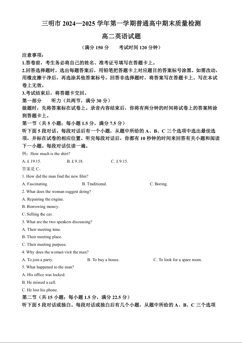 福建省三明市2024-2025学年上学期1月高二期末考试英语(解析版)