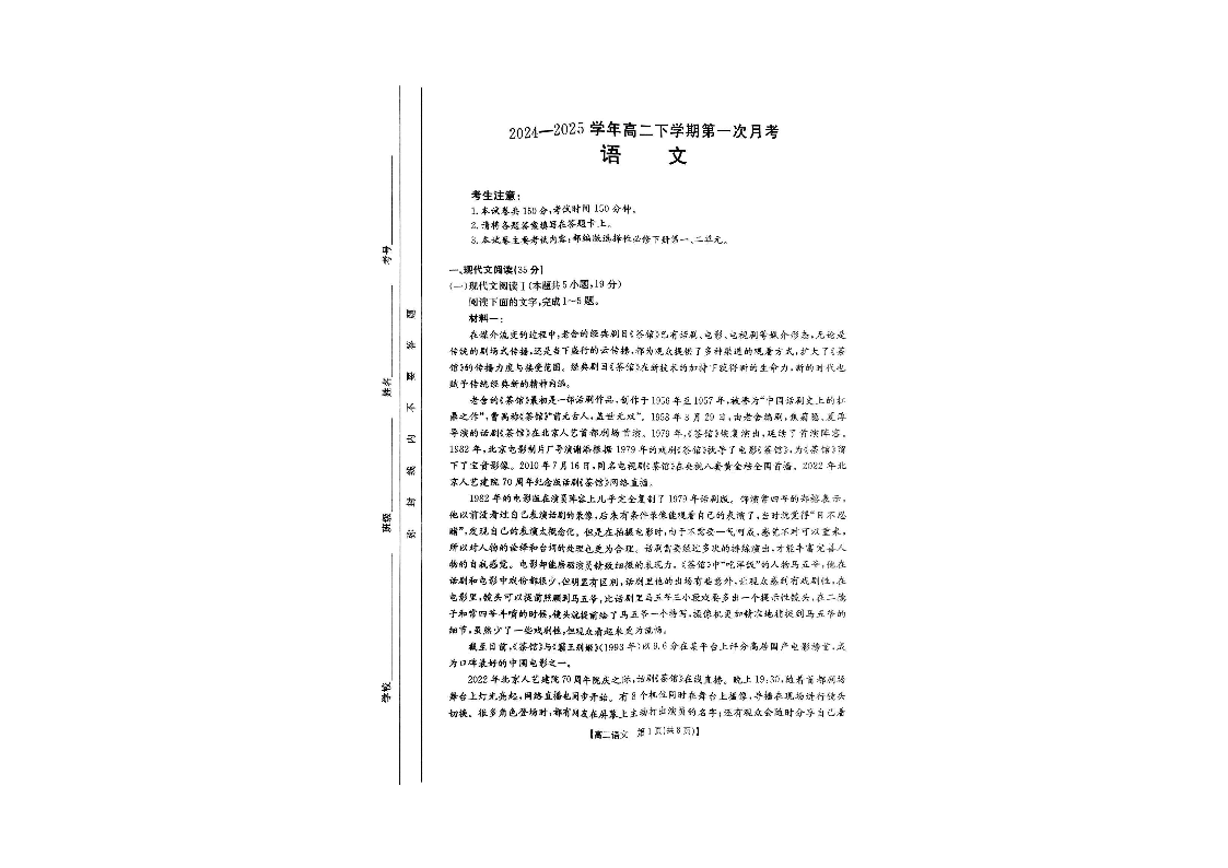 河南省洛阳市创新发展联盟2024-2025学年下学期高二第一次月考语文