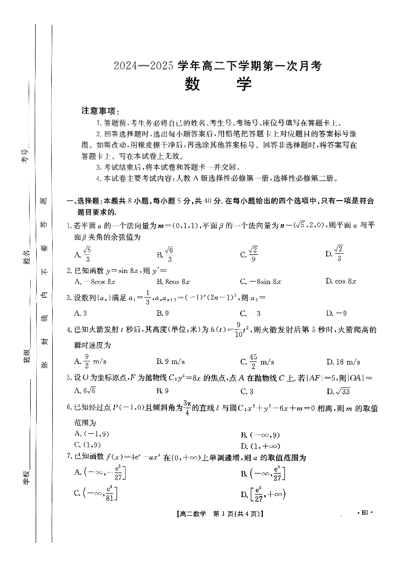 河南省洛阳市创新发展联盟2024-2025学年下学期高二第一次月考数学