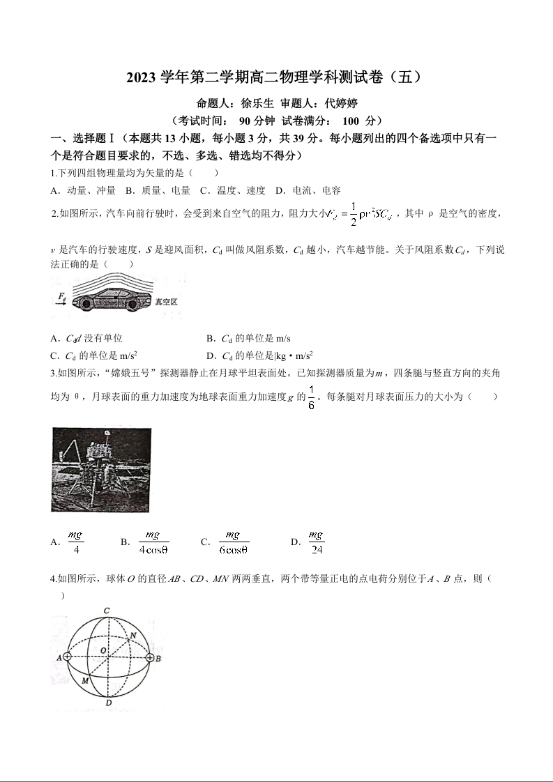 浙江省杭州市学军中学2023-2024学年高二下学期测试物理