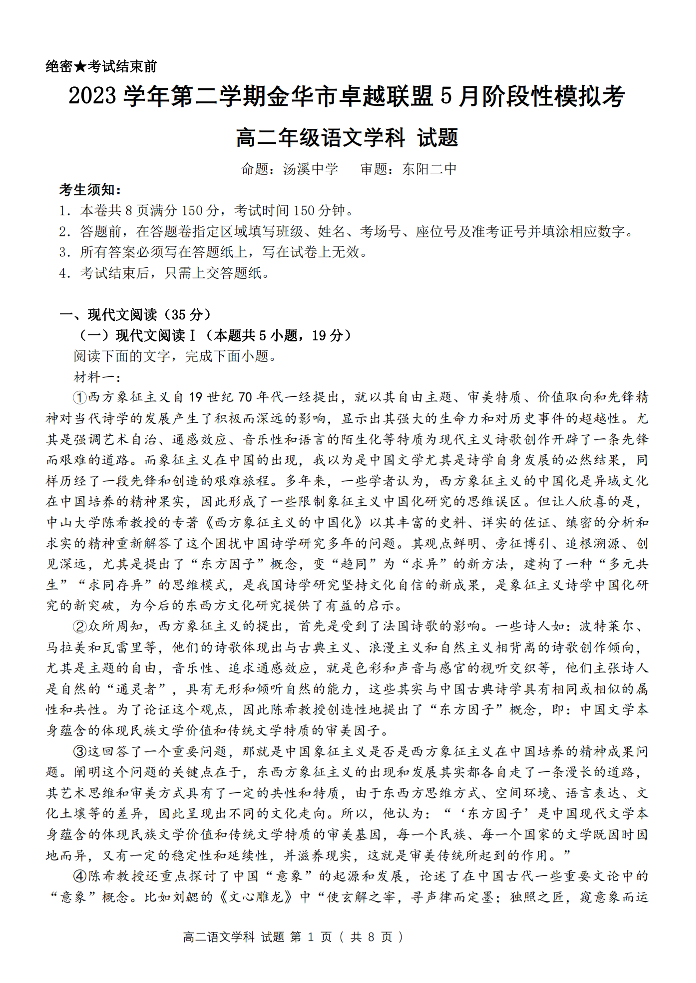 浙江省金华卓越联盟2023-2024学年高二下学期5月期中考试语文