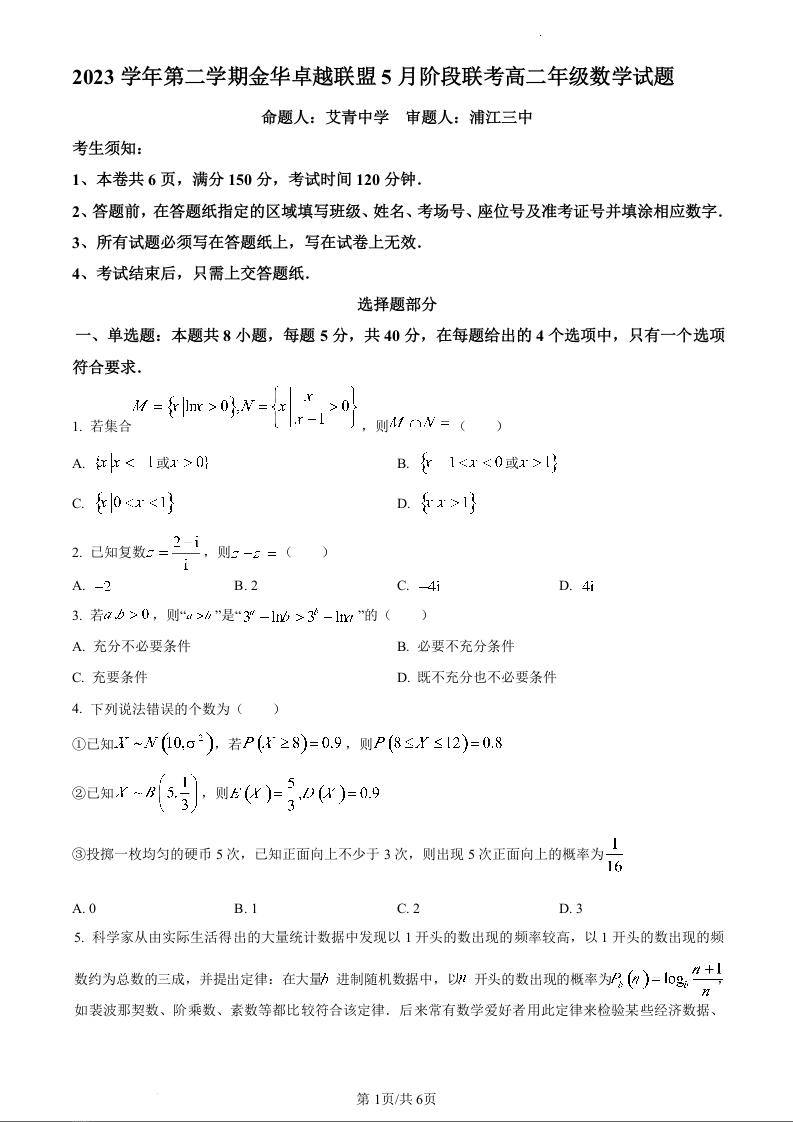 浙江省金华卓越联盟2023-2024学年高二下学期5月期中考试数学(原卷版)