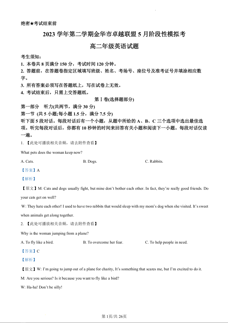 浙江省金华卓越联盟2023-2024学年高二下学期5月期中考试英语(精品解析版)