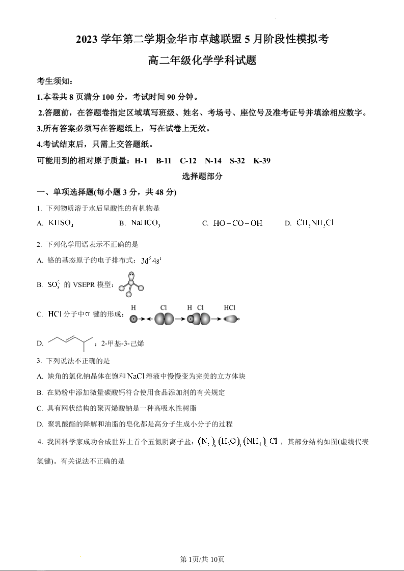 浙江省金华卓越联盟2023-2024学年高二下学期5月期中考试化学(原卷版)