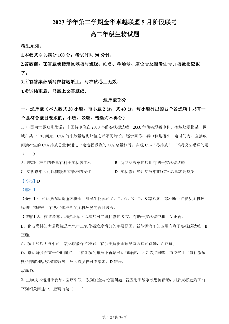 浙江省金华卓越联盟2023-2024学年高二下学期5月期中考试生物(精品解析版)