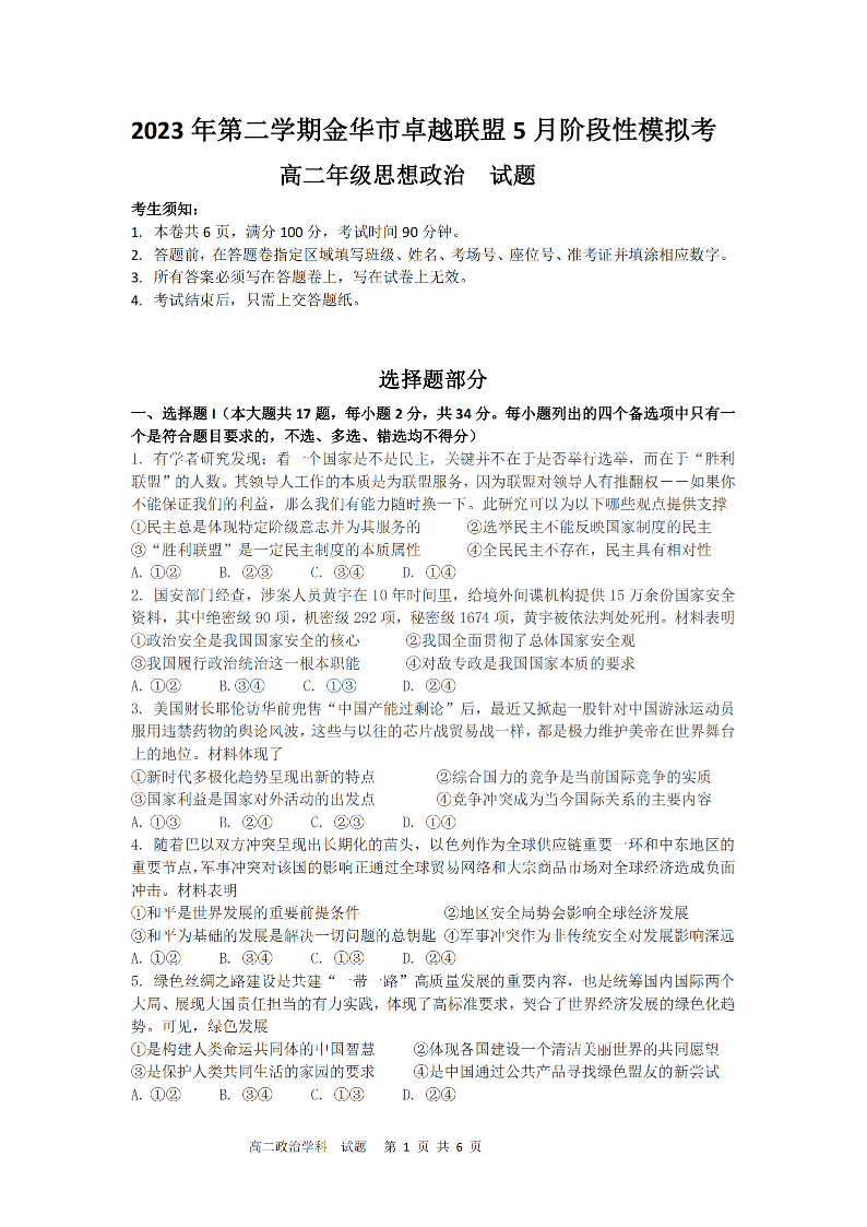 浙江省金华卓越联盟2023-2024学年高二下学期5月期中考试政治