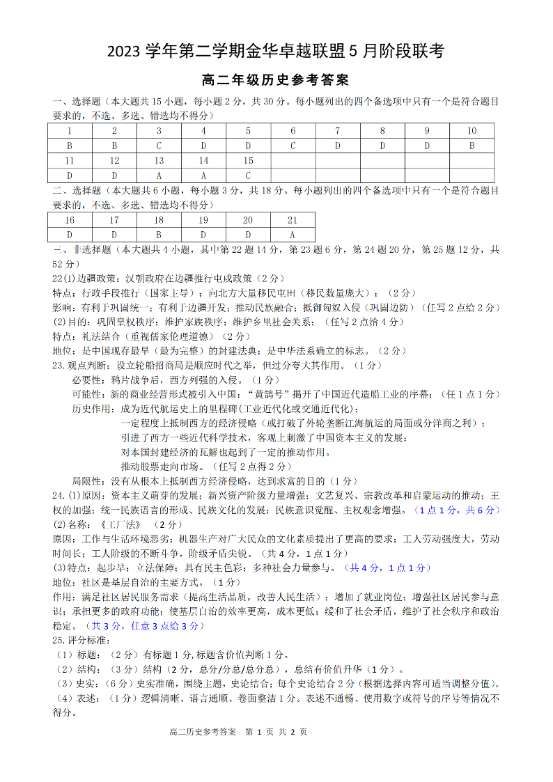 浙江省金华卓越联盟2023-2024学年高二下学期5月期中考试历史答案