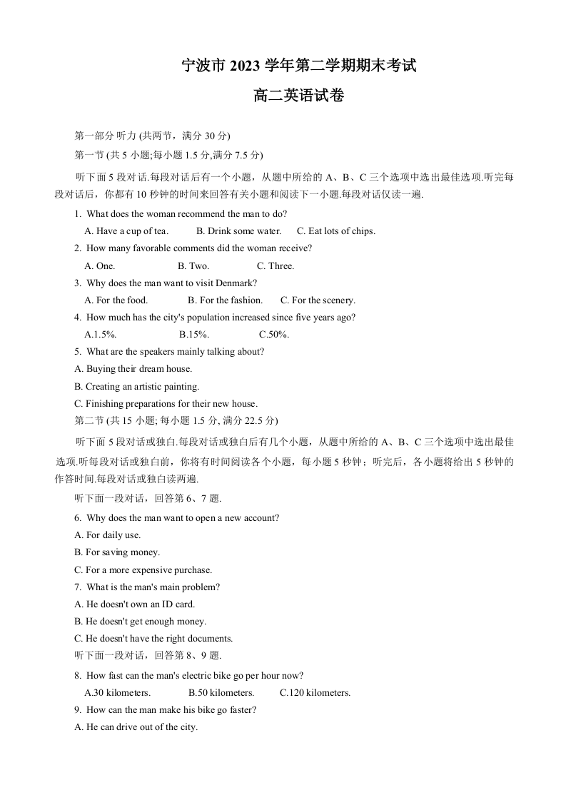 浙江省宁波市2023-2024学年高二下学期6月期末考试英语+答案