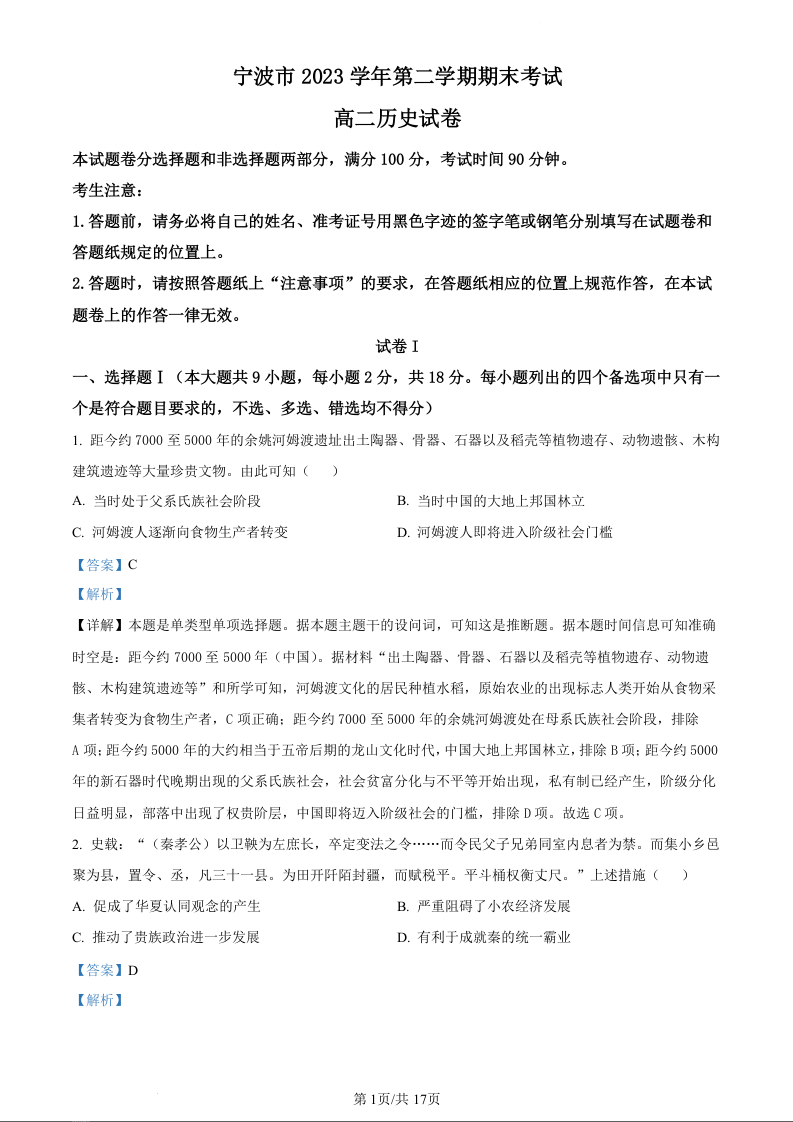 浙江省宁波市2023-2024学年高二下学期6月期末考试历史(精品解析版)