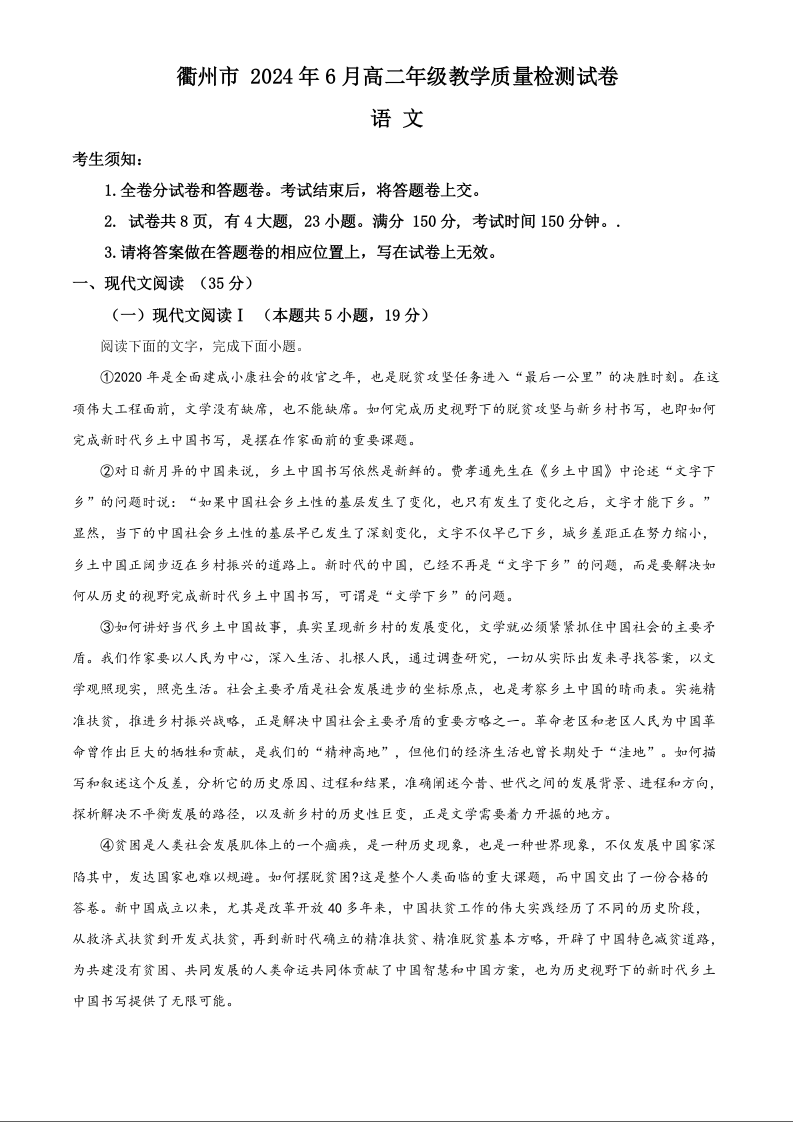 浙江省衢州市2025届高二下学期6月期末考试语文(原卷版)