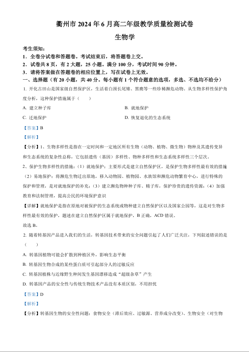 浙江省衢州市2025届高二下学期6月期末考试生物(解析版)