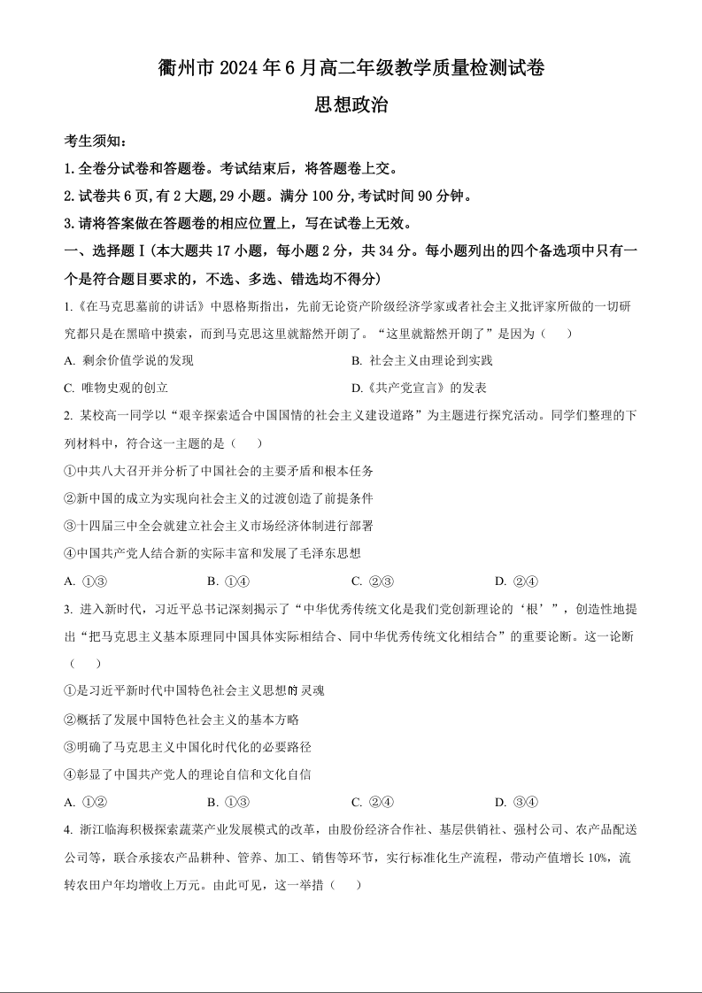 浙江省衢州市2025届高二下学期6月期末考试政治(原卷版)