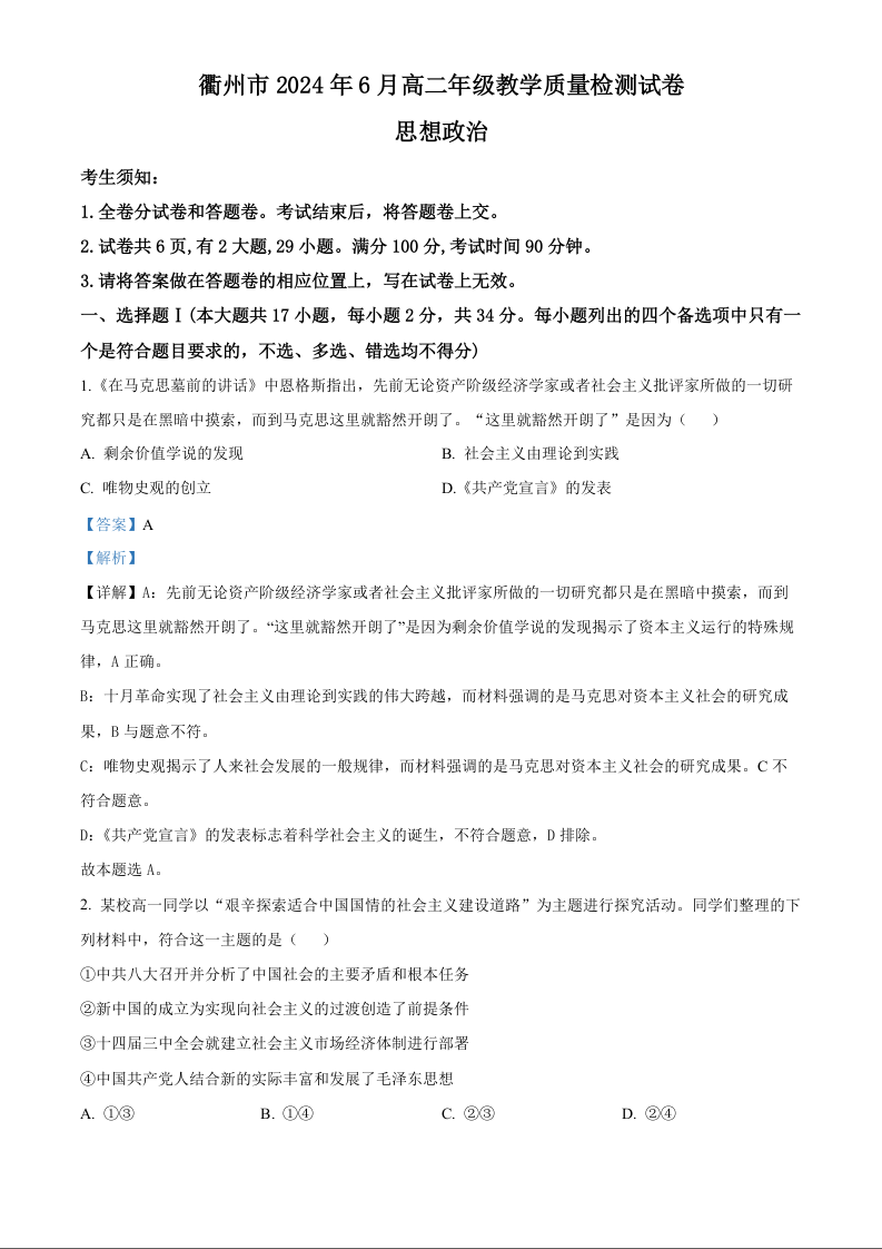 浙江省衢州市2025届高二下学期6月期末考试政治(解析版)