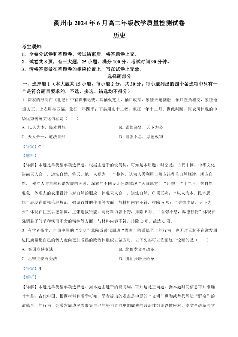浙江省衢州市2025届高二下学期6月期末考试历史(解析版)