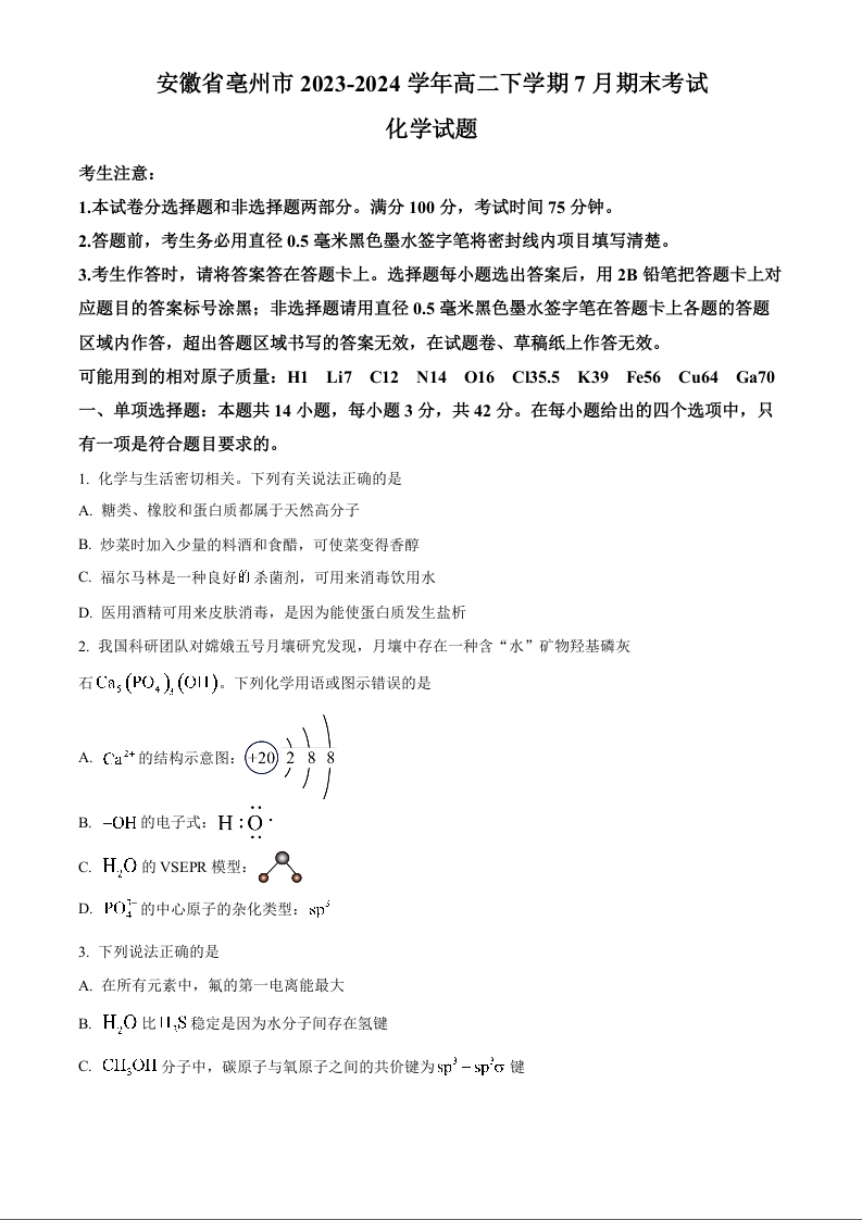 安徽省亳州市2023-2024学年高二下学期7月期末考试化学+答案