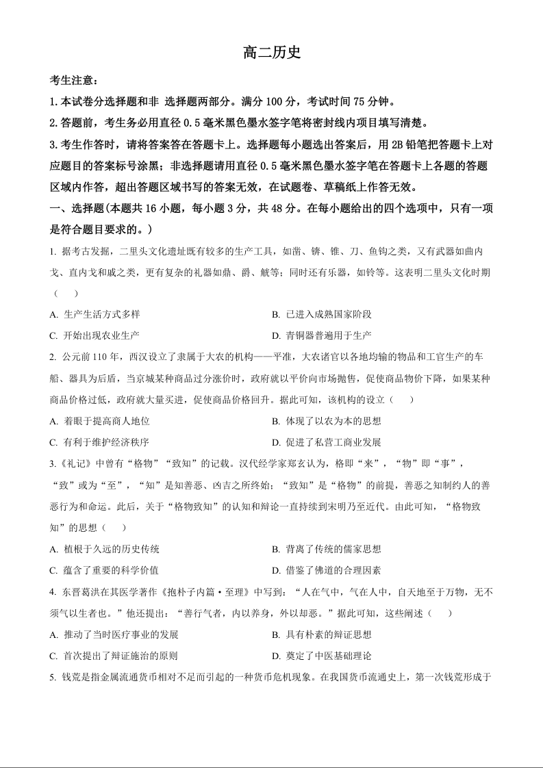 安徽省亳州市2023-2024学年高二下学期7月期末考试历史+答案