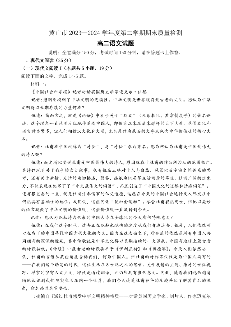 安徽省黄山市2025届高二下学期7月期末考试语文+答案