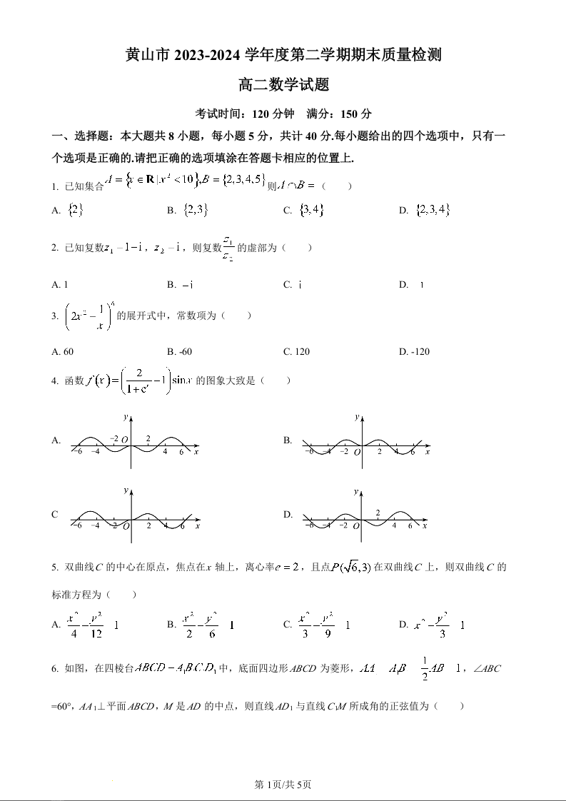安徽省黄山市2025届高二下学期7月期末考试数学(原卷版)