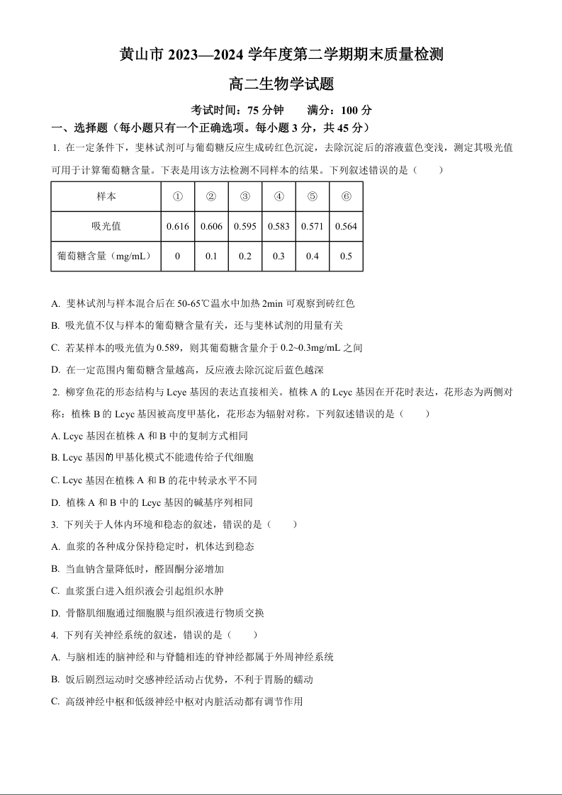 安徽省黄山市2025届高二下学期7月期末考试生物+答案