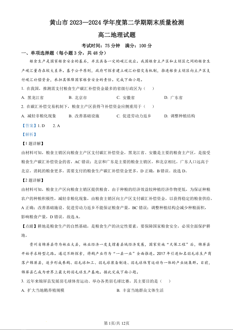 安徽省黄山市2025届高二下学期7月期末考试地理(精品解析版)