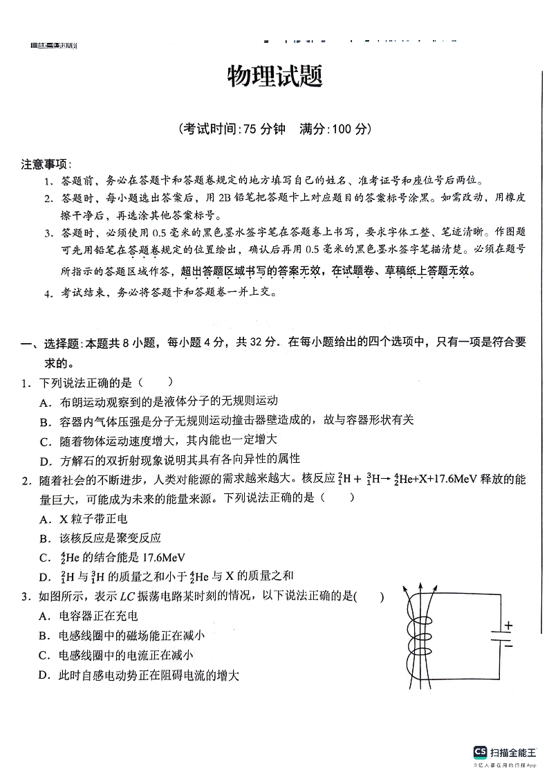 安徽省省十联考高2025届下学期7月期末考试物理