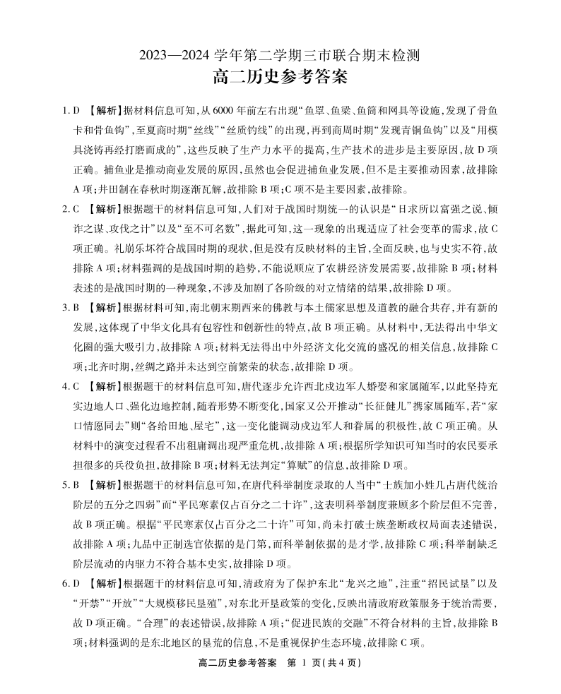 安徽省县中联盟(三市联合)2025届下学期7月期末检测历史答案