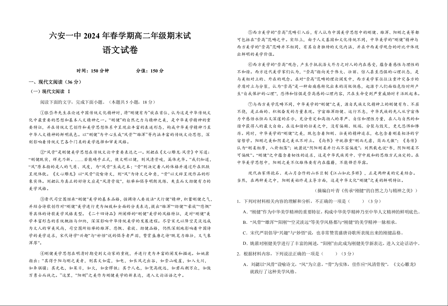 安徽省六安第一中学高2025届下学期7月期末考试语文+答案